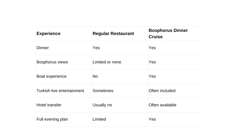 A restaurant can give you a meal. A Bosphorus dinner cruise in Istanbul gives you dinner, views, entertainment, movement, and a more memorable setting.