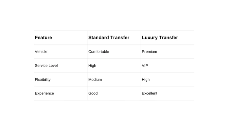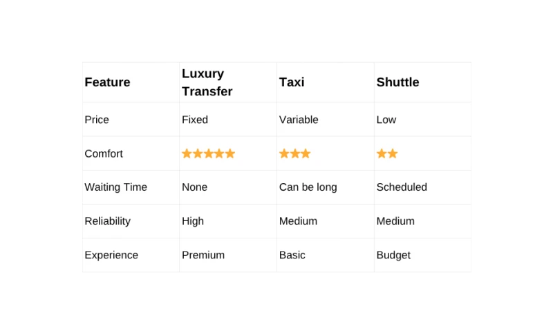 👉 Meskipun sedikit lebih tinggi dibandingkan taksi, transfer mewah menawarkan nilai yang jauh lebih signifikan.